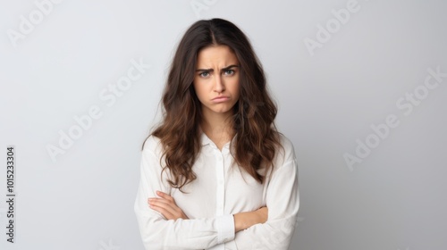 A young woman in a white blouse crosses her arms and eyes the viewer with a displeased and doubtful expression against a neutral background.