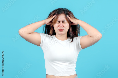 A young woman in a white crop top reacts with shock and distress, holding her head in her hands against a bright blue background, expressing frustration or panic