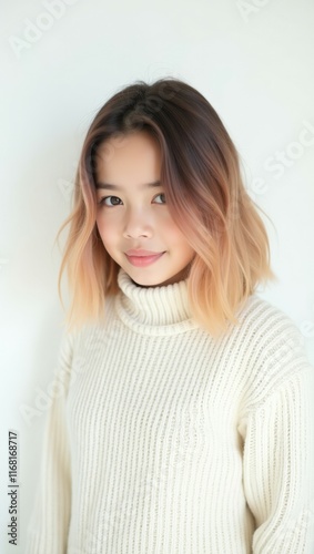 A young woman in a white sweater with soft pink highlights in her hair, smiling sweetly, captures warmth and joy.