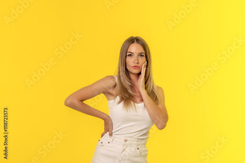 A young woman in a white tank top stands against a bright yellow background, posing thoughtfully with her hand on her face