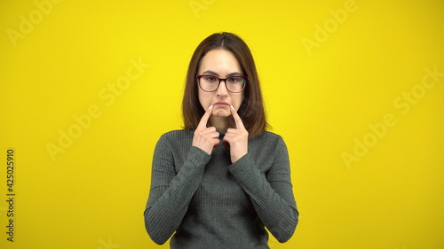 A young woman makes a sad smile on her face with her fingers on a yellow background. Woman with glasses and a green sweater.