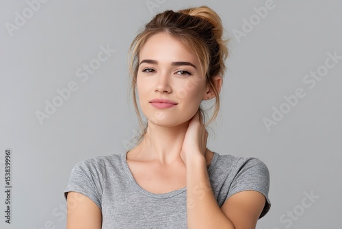 A young woman poses against a gray backdrop with her hair in a casual bun and her hand gently touching her neck