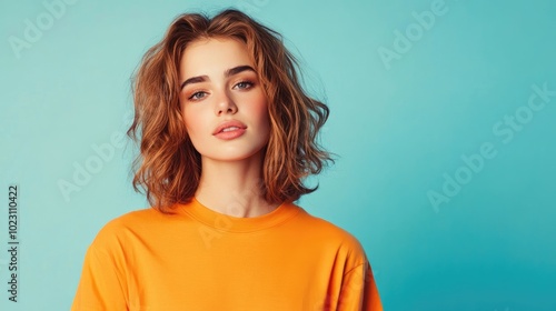 A young woman poses confidently against a vibrant blue background, showcasing her stylish orange shirt and natural beauty.