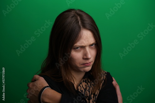 A young woman poses in a studio with a green background, showing natural emotions, full of expressions and dynamic movements. Unedited image
