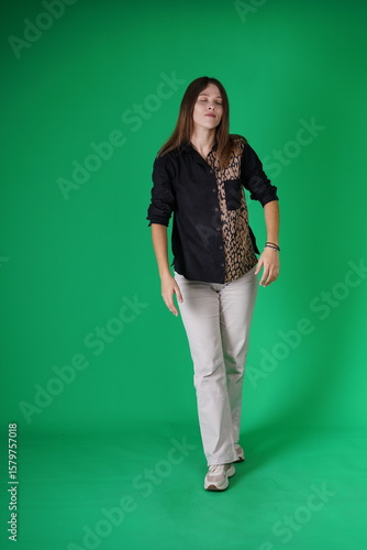 A young woman poses in a studio with a green background, showing natural emotions, full of expressions and dynamic movements. Unedited image