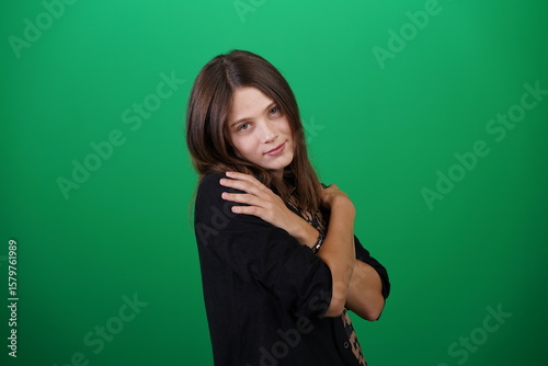 A young woman poses in a studio with a green background, showing natural emotions, full of expressions and dynamic movements. Unedited image