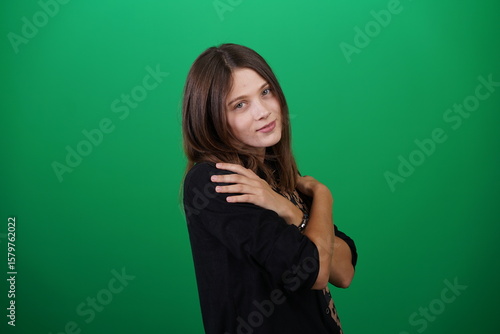A young woman poses in a studio with a green background, showing natural emotions, full of expressions and dynamic movements. Unedited image