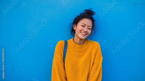 A young woman radiates joy against a vivid blue backdrop, her genuine smile lighting up the frame. The vibrant composition speaks of positivity and simple pleasures.
