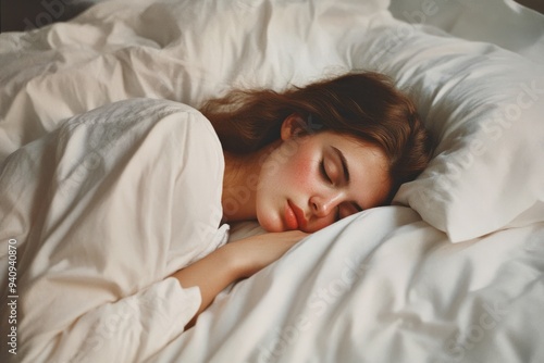 A young woman sleeps peacefully in her cozy bed. Soft pillows create a calming atmosphere. The light highlights her serene expression. Emphasizing tranquility. Generative AI