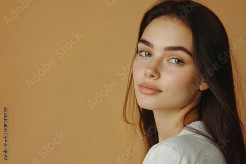 A young woman smiles gently while displaying her refined features in a studio with warm tones, emphasizing her natural beauty. Generative AI