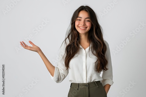 A Young Woman Smiling and Gesturing Happily With an Open Palm Against a Plain White Background, Dressed in a Formal White Shirt and Green Trousers, Showcasing a Joyful Expression