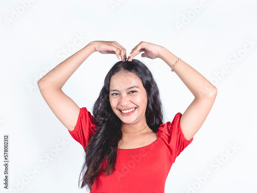 A young woman strikingly posing a "heart" shape with her arms in front of the camera. Expressing love, happiness and romance.