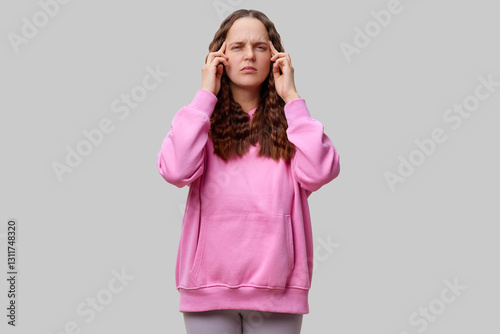 A young woman wearing a pink hoodie stands indoors with a neutral background, expressing frustration by holding her head and closing her eyes while trying to block out noise