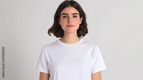 A young woman wearing a plain white t-shirt stands against a neutral background, showcasing a simple and modern style.