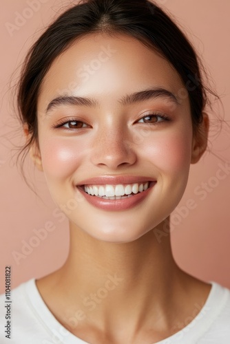 A young woman with a bright smile stands against a pastel pink backdrop, embodying youthfulness, positivity, and the simplicity of contemporary beauty.