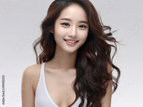 A young woman with a radiant smile poses confidently in a white bikini top. Her carefree expression and flowing hair exude a sense of joy and freedom.