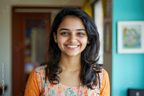 A young woman with a radiant smile, wearing a floral dress, poses for a portrait.