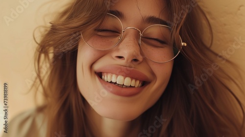 A young woman with a radiant smile wearing round glasses and with her eyes closed exuding a sense of joy and contentment.