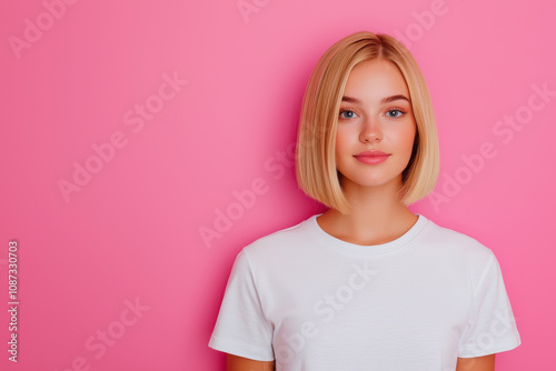A young woman with a stylish bob haircut poses against a vibrant pink background, showcasing natural beauty and confidence. Perfect for fashion themes.