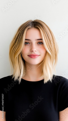 A young woman with a stylish, shoulder-length blonde hairstyle smiles softly against a light background, wearing a simple black t-shirt.