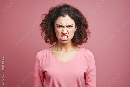 A young woman with an evil expression, making photography difficult in a tense and stressful situation.