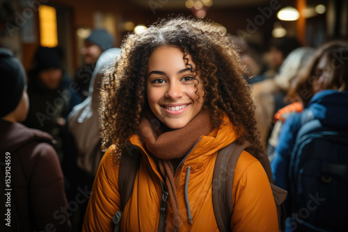 A young woman with beautiful curly hair smiles warmly while surrounded by a busy environment, radiating happiness and connection amidst the vibrant social atmosphere.
