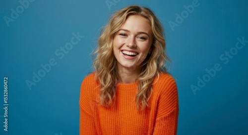 A young woman with blonde, wavy hair smiles brightly while wearing an orange sweater against a blue background