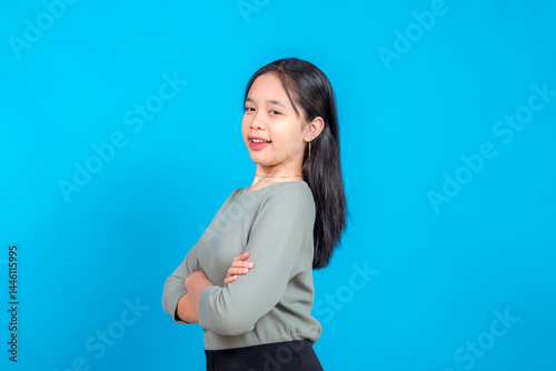 A young woman with crossed arms offers a friendly, slightly coy smile while glancing to the side. Her warm expression and indirect gaze create a sense of gentle charm and approachability.
