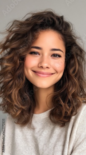 A young woman with curly brown hair smiles warmly, wearing a cozy light-colored sweater against a neutral background.