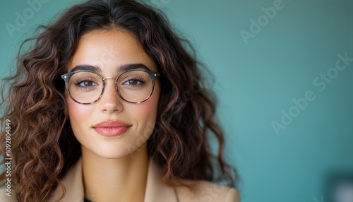 A young woman with curly hair and glasses smiles warmly in an office setting