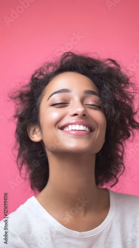 A young woman with curly hair smiles joyfully against a vibrant pink background, conveying a sense of happiness and confidence.