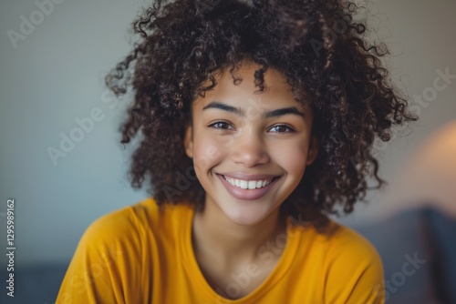 A young woman with curly hair smiles warmly, embodying joy and positivity in a cozy indoor setting.