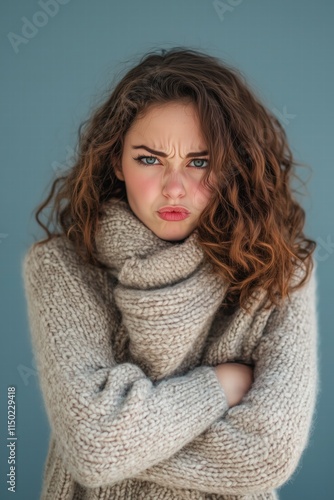 A young woman with curly hair wearing a cozy knitted sweater and scarf, displaying a pouty expression with crossed arms against a blue background.
