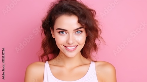 A young woman with curly hair winks playfully, making an "okay" gesture, set against a bright pink background, exuding confidence and charm.