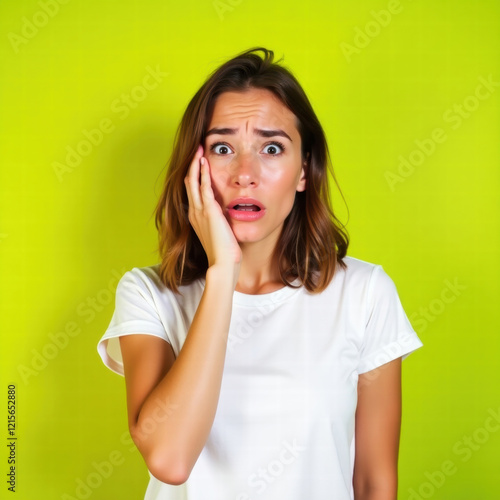A young woman with light skin and shoulder-length brown hair, standing against a vibrant green background. Her facial expression is one of surprise or concern
