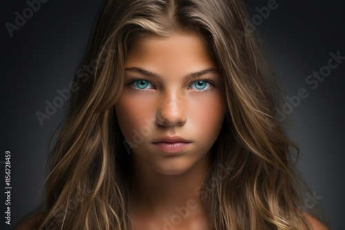 A young woman with long brown hair and blue eyes