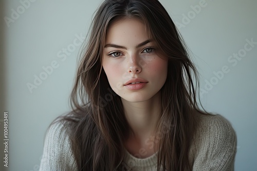 A young woman with long brown hair looking at the camera. Perfect for articles about beauty, fashion, and youth.