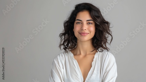 A young woman with long, dark, curly hair and light makeup is smiling at the camera.