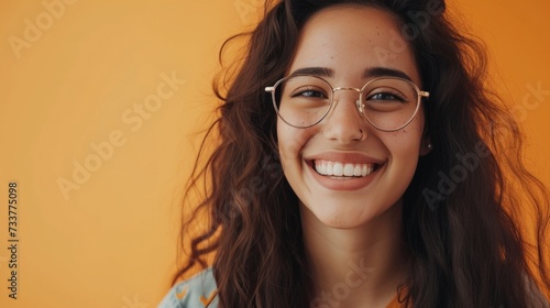 A young woman with long dark hair wearing round glasses smiling brightly against an orange background.