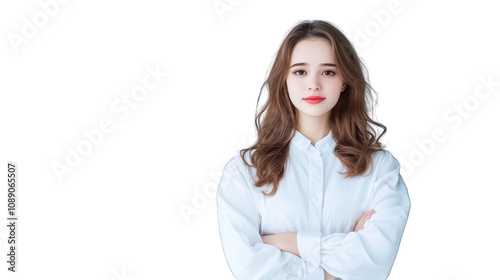 A young woman with long hair poses confidently in a white shirt. Transparent background.