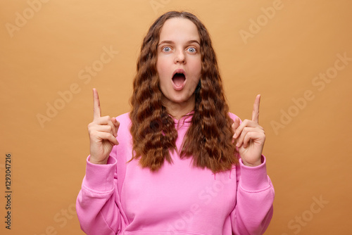 A young woman with long, wavy hair shows a surprised expression with her mouth open wide