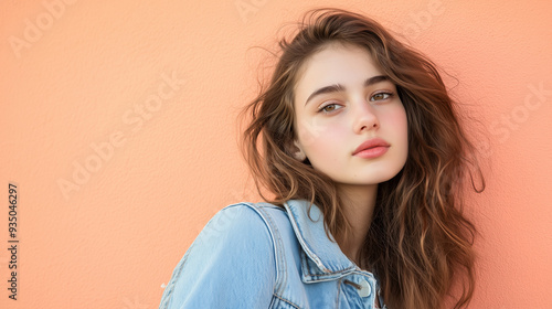 A young woman with long, wavy hair stands against a vibrant orange wall, wearing a denim jacket and presenting a relaxed, stylish look that reflects Gen Z culture, copy space