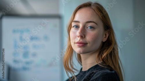 A young woman with red hair and blue eyes wearing a black top looking to the side with a gentle expression standing in front of a whiteboard with writing on it.