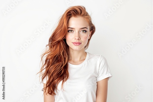 A young woman with red wavy hair and natural makeup wearing a white T-shirt, standing against a clean white background. Concept of beauty. Ai generative