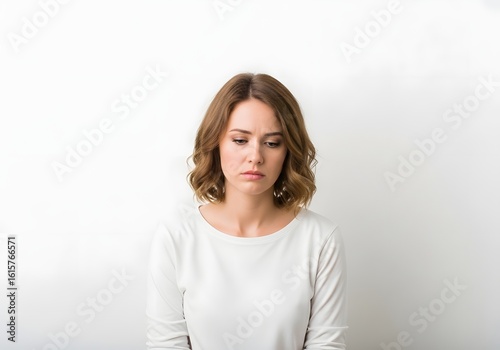 A young woman with shoulder-length brown hair, wearing a white long-sleeved top, stands against a plain white background.