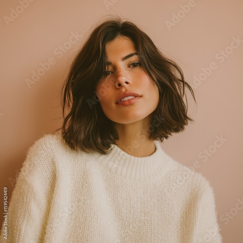 A young woman with shoulder-length brown hair wears a cozy white knit sweater, posing against a soft beige background with a neutral, confident expression.