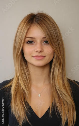 A young woman with straight, long blonde hair wears a fitted black top. Her expression is calm and inviting, set against a plain neutral backdrop