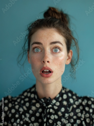 A young woman with striking blue eyes. She is wearing a black and white top and her hair is styled in a messy bun. Her mouth is slightly open and her gaze is directed straight at the camera.