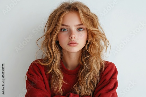 A young woman with wavy hair wearing a red sweater, posing against a plain backdrop.