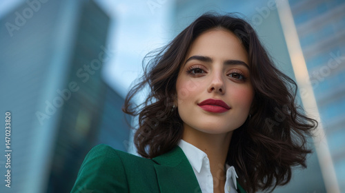 A young woman with wavy hair wears a green blazer and smiles confidently while standing against a backdrop of modern skyscrapers in an urban environment